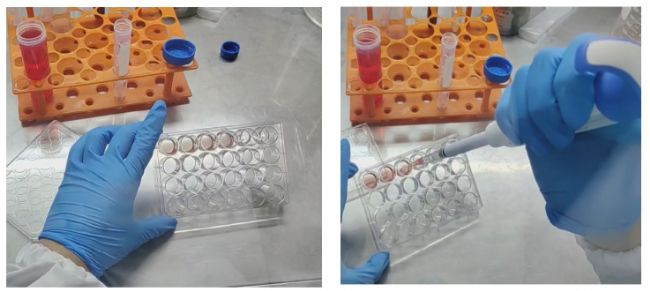 2.1、清洗:吸掉原有培養基,貼壁緩慢加入1mL PBS緩沖液并輕輕晃動,然后沿培養皿邊緣吸去PBS緩沖液;