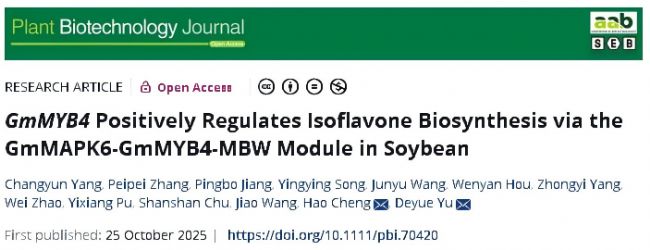 2025年10月25日,南京農業大學國家大豆改良中心喻德躍教授團隊在Plant Biotechnology Journal(IF: 10.5)上在線發表了題為GmMYB4 Positively Regulates Isoflavone Biosynthesis via the GmMAPK6-GmMYB4-MBW Module in Soybean的研究論文,通過DAP-seq和RNA-seq聯合分析,從多維度系統解析了轉錄因子GmMYB4調控大豆異黃酮生物合成的分子機制,首次揭示GmMAPK6-GmMYB4-MBW調控模塊在異黃酮代謝網絡中的核心作用,為高異黃酮含量大豆品種培育提供關鍵理論依據與基因資源。藍景科信為該研究提供了DAP-seq和RNA-seq技術支持。