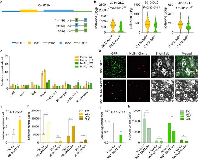 為挖掘調控大豆異黃酮含量的關鍵基因,本研究收集了219份大豆種質資源在三種不同環境環境下的總異黃酮含量(TIC)、染料木黃酮類含量(GEC)、大豆苷元類含量(DAC)及黃豆黃素類含量(GLC)數據,并開展全基因組關聯分析(GWAS),在11號染色體8.15-8.27 Mb區間鎖定231個顯著SNP,并最終篩選出GmMYB4(Glyma.11g107100)作為核心候選基因——該基因屬于R2R3-MYB家族,與擬南芥中調控類黃酮合成的MYB4同源。通過單倍型分析發現:攜帶GmMYB4H1單倍型的大豆材料,其GLC含量在三年環境中均顯著高于H2單倍型材料,證明GmMYB4H1是調控異黃酮的“優異單倍型”。