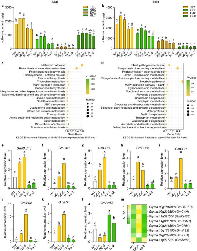 研究團隊對GmMYB4過表達株系、敲除突變體及WT材料進行轉錄組測序(RNA-seq),發現GmMYB4在調控代謝途徑中發揮關鍵作用,尤其對類黃酮和異黃酮的生物合成途徑調控作用顯著。RT-qPCR結果顯示,異黃酮生物合成途徑中的7個關鍵基因(GmPAL1.3、GmC4H、GmCHS8、GmCHR1、GmCHI1、GmIFS2 和GmIFS1)在GmMYB4過表達株系中顯著上調,在gmmyb4突變體中則顯著下調。