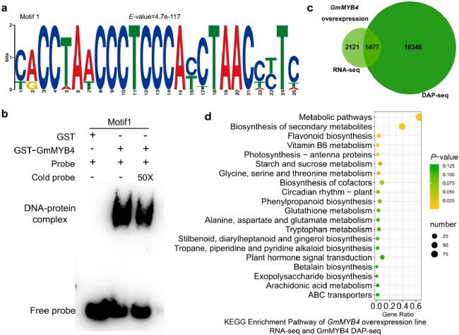 圖4 通過DAP-seq與RNA-seq在全基因組中對GmMYB4結合位點及靶基因進行分析。