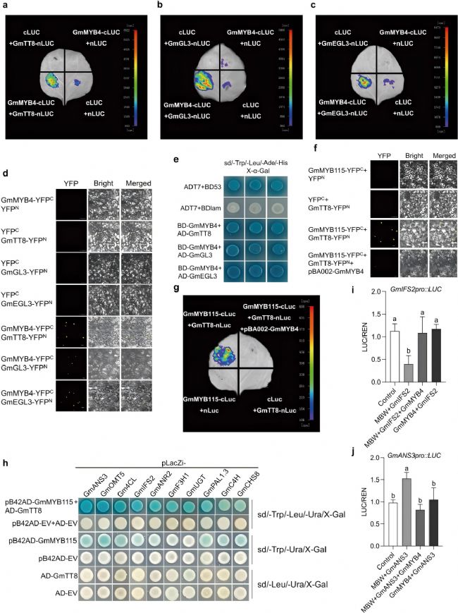 MBW復合體由MYB、bHLH、WD40三類蛋白組成,此前在蒺藜苜蓿種發現其可抑制異黃酮合成酶(IFS)基因表達。研究人員通過酵母單雜交(Y1H)實驗檢測了GmMYB115-GmTT8 復合體與10個關鍵基因(GmANS3、GmOMT5、Gm4CL、GmIFS2、GmANR2、GmF3H1、GmUGT、GmPAL1.3、GmC4H、GmCHS8)啟動子的結合能力。結果表明,GmMYB115-GmTT8復合體可直接結合苯丙烷、異黃酮及花青素生物合成相關基因的啟動子,凸顯了其在這些代謝途徑中的調控作用。研究團隊聚焦GmMYB4與MYB-bHLH-WD復合體(MBW)的互作機制,通過LCI、BiFC、Y2H、雙熒光素酶報告實驗顯示GmMYB4與大豆中bHLH類轉錄因子(GmTT8、GmGL3、GmEGL3)互作,競爭性干擾GmMYB115–GmTT8復合體的形成,進而解除MBW對異黃酮合成關鍵基因GmIFS2的抑制并減弱對花青素合成基因GmANS3的激活,實現異黃酮與花青素代謝流的平衡調控。