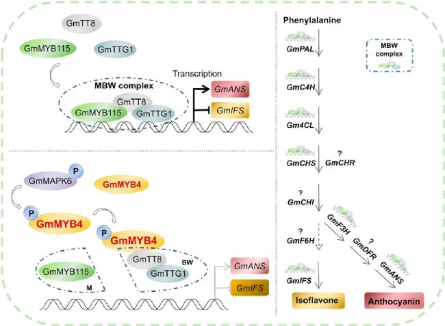 本研究系統揭示了GmMAPK6-GmMYB4-MBW模塊調控大豆異黃酮生物合成的分子機制:GmMAPK6通過磷酸化激活GmMYB4,GmMYB4進而競爭結合MBW復合體中的bHLH成員,解除MBW對異黃酮合成基因的抑制并抑制花青素合成基因,最終實現異黃酮含量的精準調控。為解析異黃酮代謝調控網絡提供了新視角,并為大豆品質改良與代謝工程育種提供了重要靶點與理論依據。