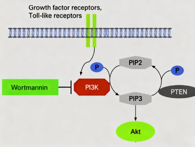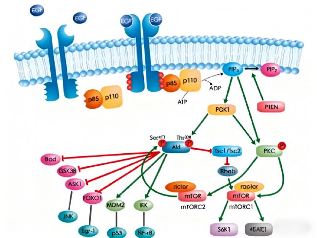 PI3K:即磷脂酰肌醇3-激酶,通常為由調(diào)節(jié)亞基p85和催化亞基p110構(gòu)成的異源二聚體。其激活可將細(xì)胞膜上的磷脂酰肌醇二磷酸轉(zhuǎn)化為第二信使——磷脂酰肌醇三磷酸,從而啟動(dòng)下游信號(hào)級(jí)聯(lián)反應(yīng)。
