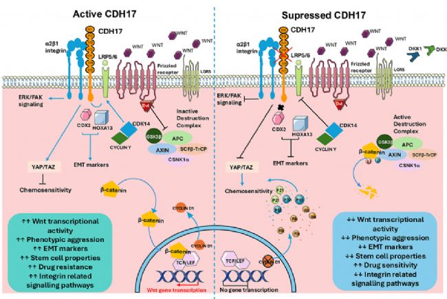 Wnt/β-catenin通路與CDH17介導的腫瘤生物學調控示意圖