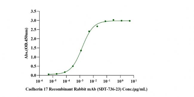 Immobilized CDH17/LI-cadherin His Tag, Human (Cat. No. UA010825) at 2.0μg/mL (100μL/well) can bind Cadherin 17 Recombinant Rabbit mAb (SDT-736-23) (Cat. No. S0B2291) with EC50 of 1.25-1.75ng/mL.