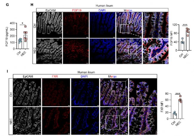 2)NEC 患者腸上皮細胞(EpCAM+)中 FXR 及 FGF19 蛋白水平顯著升高(免疫熒光驗證,圖 1)。