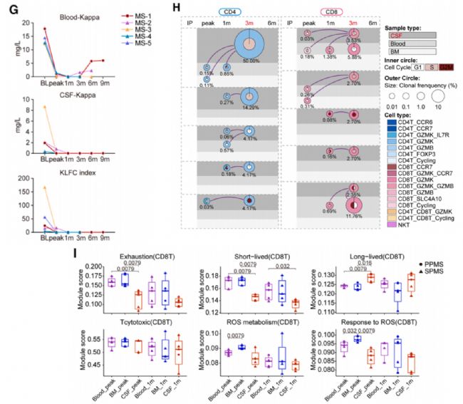 03:單細胞組學:解釋“誰”在驅動炎癥變化其中B細胞/漿細胞軸顯著下降,對應 CSF 游離 κ 輕鏈 (KFLC) 水平下降(下圖G);同時單細胞分析 (下圖H–I) 顯示 CAR-T 在 CSF 中持續存在并保持活化表型。這部分解釋了 Luminex 讀數中炎癥因子下降的來源—是CAR-T 清除了高分泌漿細胞與活化的髓系細胞。