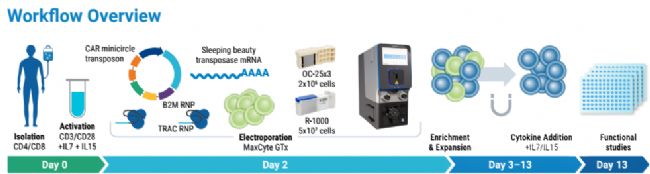 這正是這份應用報告中,來自納瓦拉大學的研究者們所展示的核心價值。他們使用的 MaxCyte GTx™ 流式電轉染平臺,完美解決了這個“一步投遞”的難題。它用一種非病毒的方式,在一次電擊操作中,同時將兩種CRISPR RNP、睡美人轉座酶mRNA和CD33-CAR轉座子minicircle DNA這四種功能各異的生物大分子,成功導入T細胞。