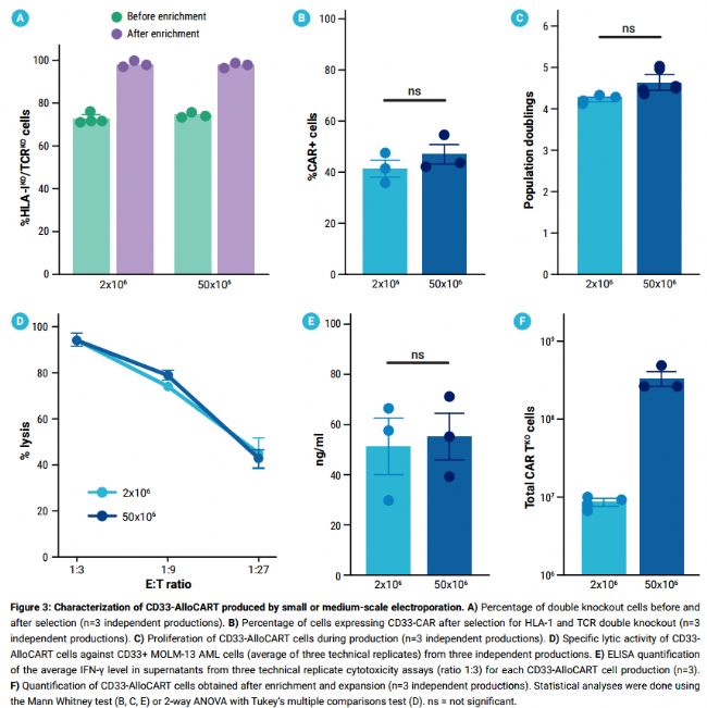 • 簡單高效: 整個基因工程的核心步驟被簡化為一次電轉,大大縮短了制備時間。數據顯示,經過改造,平均能獲得32.4%的CD33-CAR陽性細胞,超過69%的細胞成功實現了雙基因敲除。