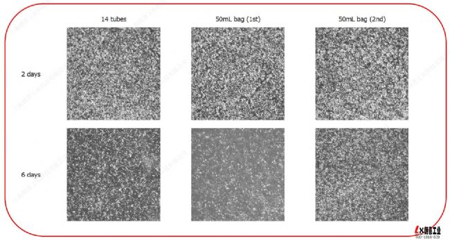 結論:50mL袋裝細胞的貼壁情況與14個凍存管的細胞相當。