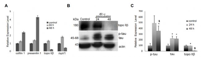 應用案例:Aβ1-42纖維構建Wistar大鼠小腦顆粒神經元(CGNs)AD細胞模型,用于探究DNA拓撲異構酶IIβ(Topo IIβ)在AD病理過程中的作用及其與核受體Nurr1的調控關系。