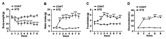 造模方法:8周齡雄性 C57BL/6J小鼠在適應性喂養一周后,隨機分為對照組,糖尿病模型組(STZ組)。糖尿病模型組小鼠以55mgkg劑量連續5天腹腔注射STZ溶液(abs812888),對照組注射相同劑量的檸酸緩沖液。通過尾靜脈取血,使用血糖儀測量空腹血糖水平,將空腹血糖高于11.1 mmol/L 的小鼠篩選為成功的糖尿病模型組。