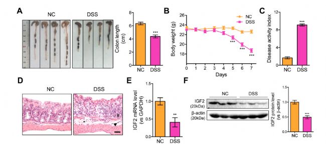 圖5 DSS誘導結腸炎小鼠結腸的外觀及長度(A)、體重及疾病活動指數(B&C)、形態學(D)以及 mRNA 水平及蛋白水平變化
