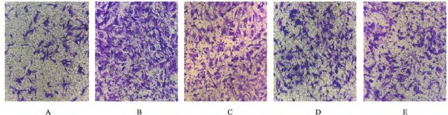 圖7 IL-4 誘導的 M2 型巨噬細胞對 MC38 細胞侵襲能力的影響及加味白頭翁湯含藥血清干預后的抑制作用(吉姆薩染色,×200)注:A.空白組;B.IL-4 組;C.100μmol/L;D.200μmol/L;E.500μmol/L