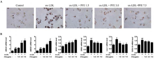 造模方法:巨噬細胞系 RAW 264.7(購自美國典型培養物保藏中心,ATCC),實驗組先用 PFE(從芫荽種子中提取的黃酮類化合物)(1.5、3.0、7.5 μg/mL)預處理 2h。對照組不加 PFE。然后添加 ox-LDL(abs47014903)至終濃度 100 μg/mL,與細胞共孵育 24h。