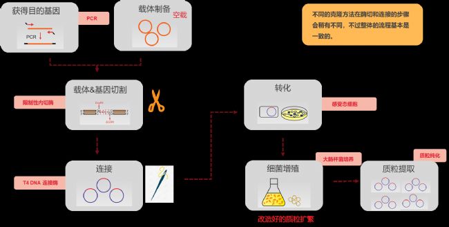 酶切連接法屬于經典的分子克隆方法,利用限制性內切酶切割目的基因DNA和載體DNA,再利用DNA連接酶連接DNA,最后轉化篩選及純化,完成重組基因的大量制備。