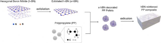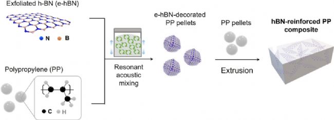 圖 3.e-hBN 增強 PP 復合材料的制備。(a) 使用共振聲學混合器用 e-hBN 納米片涂覆 PP 顆粒,(b) 將 e-hBN 涂層的 PP 顆粒熔融擠出到復合片材中。
