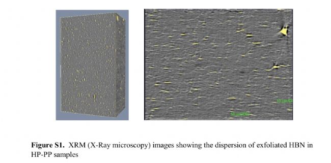 表 2.PP 和 h-BN 增強 PP 試樣的拉伸數據相反,剝落的 h-BN(e-hBN-HP)的摻入顯著提高了抗拉強度(32.88 ± 0.45 MPa,提高了 14.3%;p = 0.03)和韌性(1 MPa±11.73,提高了 11.6%;p = 0.07)。這些增強歸因于 e-hBN 納米片在聚合物基質中的均勻分散,從而實現高效的應力傳遞,正如 XRM 成像所證實的那樣(圖 S1)