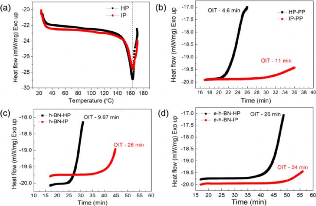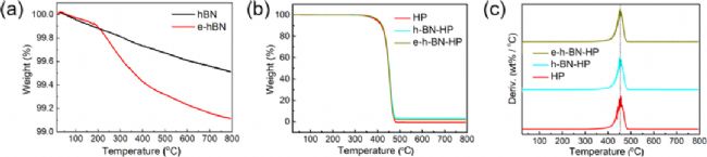 e-hBN 樣品表現出較小的重量損失,這歸因于殘留的聚(4-乙烯基吡啶)(P4VP),在 e-hBN 制備過程中用作分散劑。然而,盡管 h-BN 具有較高的熱穩定性,但添加 h-BN 后 PP 的熱分解沒有明顯改善,如圖 5b,c 所示。純 HP、h-BN-HP 和 e-hBN-HP 樣品的分解溫度約為 450 °C,降解速率相似。在 h-BN-IP 樣品中觀察到類似的趨勢,因此圖 S2 提供了這些樣品的 TGA 和 DTGA 數據。這表明,h-BN 的添加不會顯著改變 PP 基體的熱分解行為,盡管 h-BN 的存在有助于在較高溫度下保持復合材料的結構完整性。