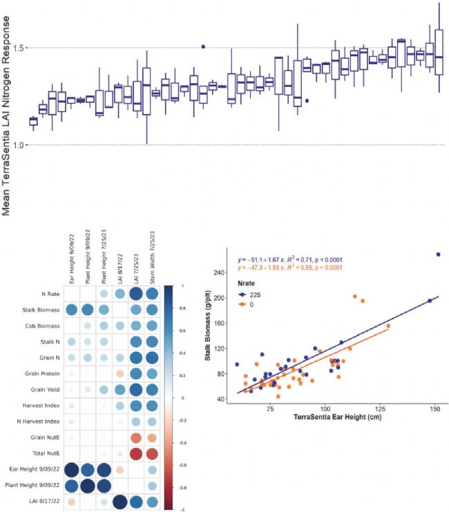 研究發現氮肥利用效率與作物產量性狀之間存在關聯。氮肥利用效率與葉面積指數呈強正相關(R²=0.957)。此外,機器人展現出預測莖稈生物量的潛力,通過建立的預測模型,可減少90%的人工測量時間