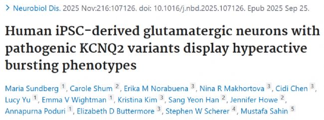 Sundberg M, Shum C, Norabuena EM, et al. Human iPSC-derived glutamatergic neurons with pathogenic KCNQ2 variants display hyperactive bursting phenotypes. Neurobiol Dis. 2025 Nov;216:107126. doi: 10.1016/j.nbd.2025.107126.