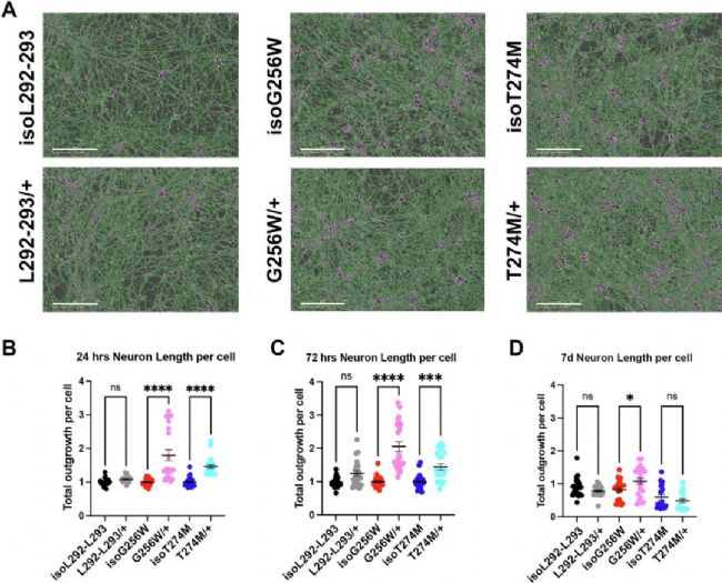 神經突生長分析:G256W/+ 和 T274M/+ 在24h、72h和7天時神經突長度顯著增加,L292_L293delinsPF/+ 無差異。