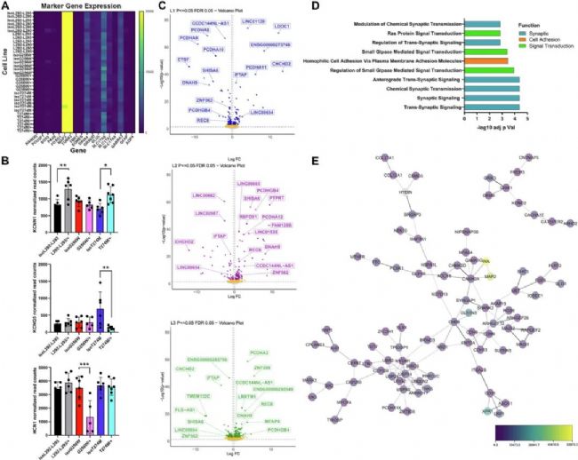 D-E: WGCNA與GO分析顯示突觸傳遞、細胞粘附等通路富集。