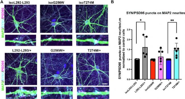 SYN1/PSD95免疫熒光顯示L292_L293delinsPF/+ 和 T274M/+ 突觸點數增加。