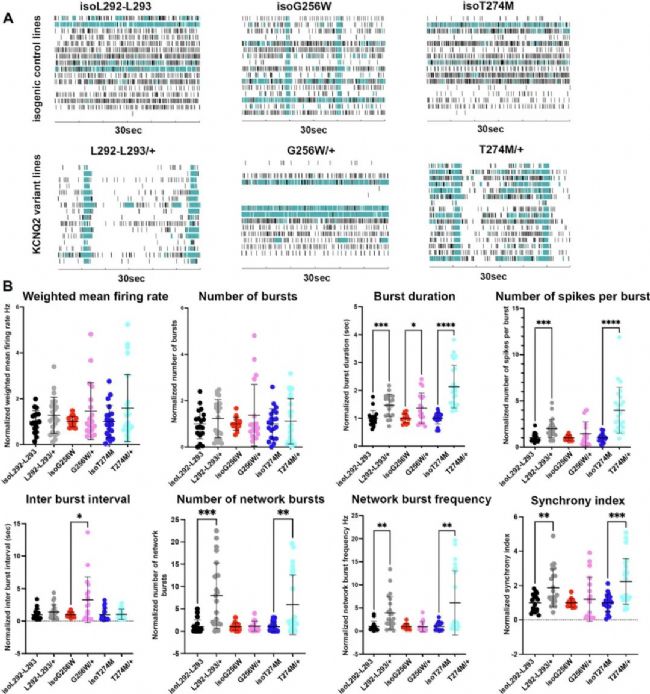 在微電極陣列(MEA)記錄中,所有三個KCNQ2變異系的爆發持續時間均顯著增加(Fig. 5)。L292_L293delinsPF/+ 和 T274M/+ 還表現出更高的網絡爆發頻率、同步性指數和每個爆發中的尖峰數。