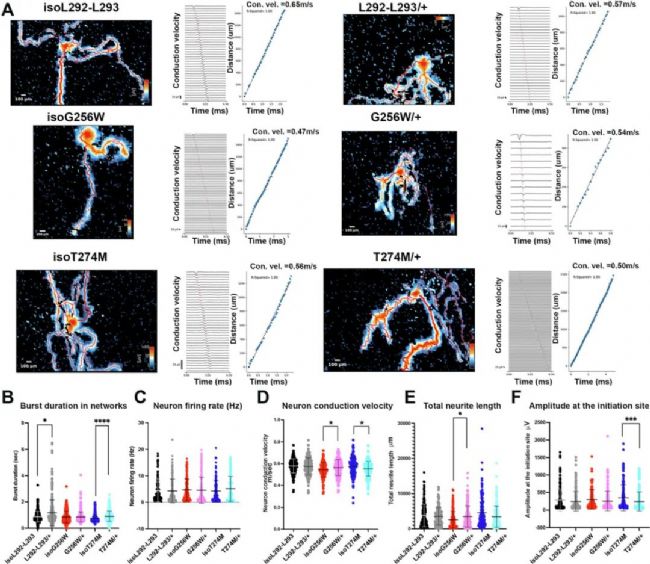 MEA記錄顯示所有變異系爆發持續時間增加,L292_L293delinsPF/+ 和 T274M/+ 網絡爆發頻率、同步性等指標上升。