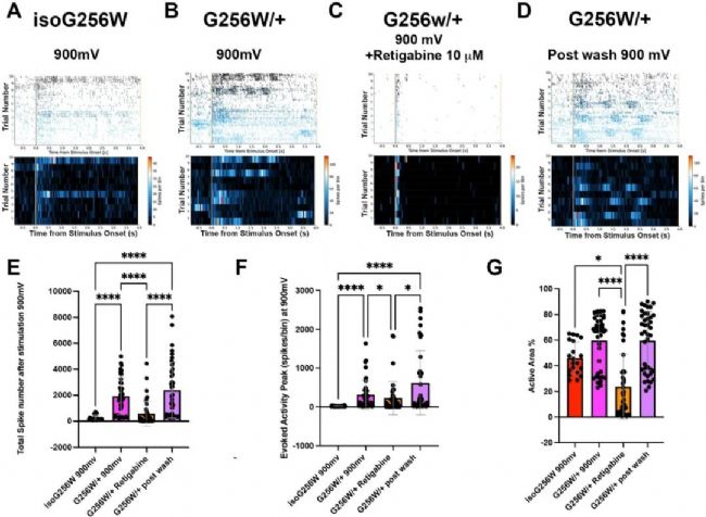在900 mV電刺激下,G256W/+ 網絡的總尖峰數顯著增加,瑞替加濱(Retigabine,10 μM)可逆轉此現象(Supplemental Fig. 7),并在洗脫后恢復,表明KCNQ2通道增強劑具有治療潛力。
