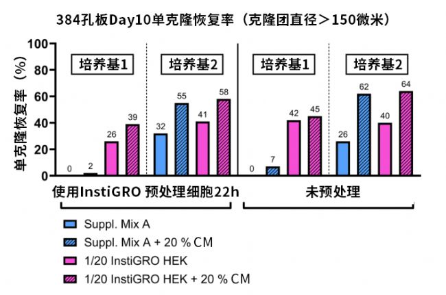 圖1. 不同補(bǔ)劑條件下的單克隆恢復(fù)率。條形圖表示在 Day10 含有直徑 ≥150 微米克隆團(tuán)的孔的百分比(每種條件 n = 48 孔)。無(wú)論是否進(jìn)行預(yù)處理,InstiGRO HEK 相比補(bǔ)劑混合物 A 都顯著提高了克隆恢復(fù)率。