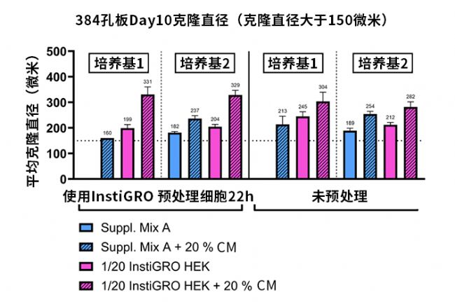 相比于補(bǔ)劑 Mix A,InstiGRO HEK 顯著增加了克隆團(tuán)直徑。