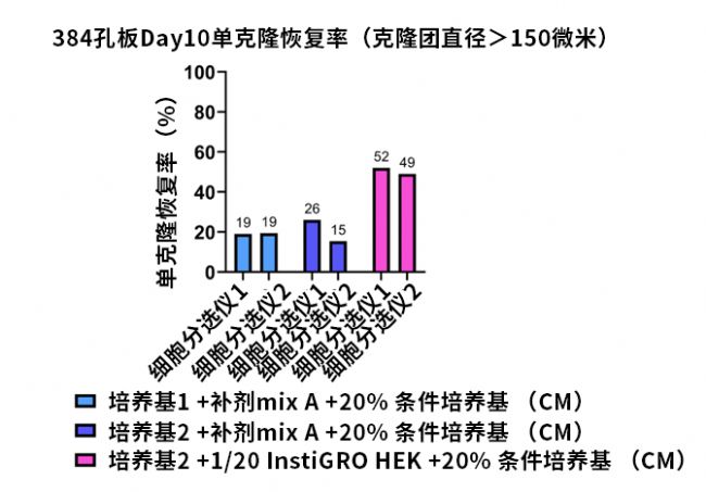 圖3. 實(shí)驗(yàn) 2 中使用兩種不同細(xì)胞分選儀的單克隆恢復(fù)率比較。條形圖表示每種條件下含有直徑 ≥150 微米的存活但克隆團(tuán)的孔的平均百分比(每種條件 n = 128-384 孔)。在兩種細(xì)胞分選儀中,InstiGRO HEK + 條件培養(yǎng)基(CM)的表現(xiàn)均優(yōu)于補(bǔ)劑 Mix A + 條件培養(yǎng)基(CM)。