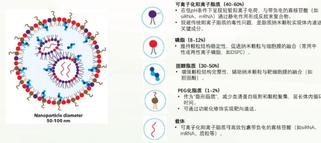 LNP通常由四種關鍵成分組成:可離子化的陽離子脂質、磷脂(兩性離子脂質)(PL)、膽固醇和PEG化脂質。
