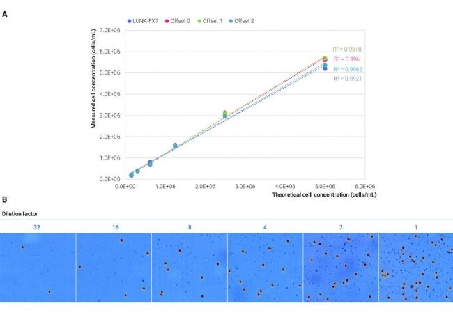 所有偏移水平下的細胞濃度均表現出較強的相關性,R²值均在 0.9921 以上(圖 1A)。盡管所有偏移水平均表現出良好的線性,但偏移水平 2 的測量結果最接近 LUNA-FX7™ 的數據。此外,LUNA-III™ 能夠準確識別并標記 PBMC(圖 1B)。