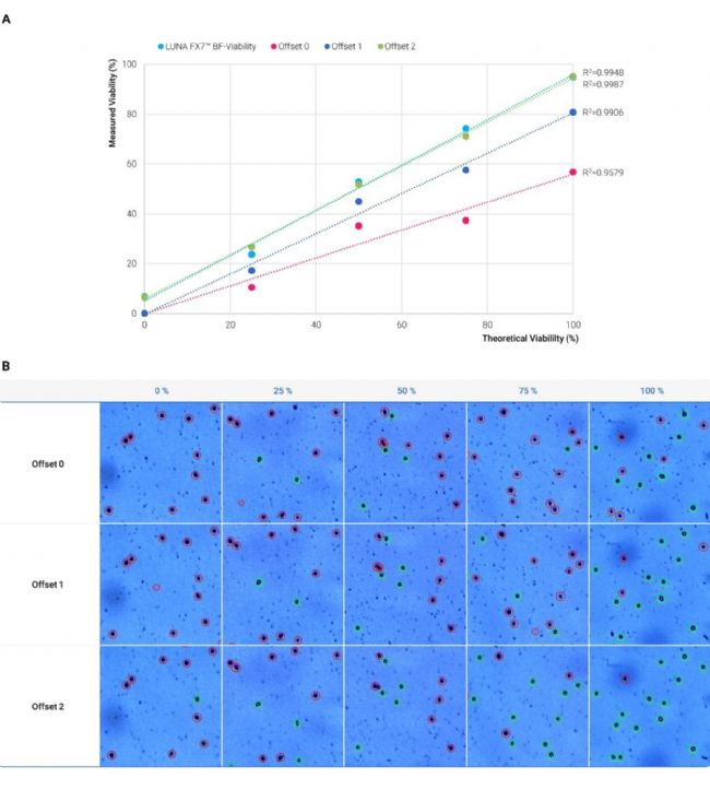 圖2. (A) 比較 LUNA-III™ 在三個偏移水平(0、1 和 2)下測得的細胞活力與 LUNA-FX7™ 的測量結果。