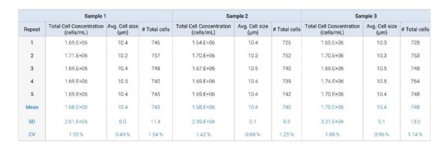 如表1所示,所有檢測結果均保持良好一致性,總細胞濃度、平均細胞尺寸及總細胞數量等參數高度吻合。細微的變動(CV值約為1%)可能源于在使用設備進行重復細胞計數時重新插入LUNA細胞計數載玻片造成的。