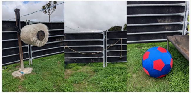本研究選取了48頭約7月齡的混合雌雄混合的安格斯牛犢,根據性別、父系、體重等指標,將其平衡地分為8組,每組6頭。其中4組為豐容組,其圈舍內安裝了三種豐容物:一個固定刷子、一條懸掛的麻繩和一個藍紅相間球(如圖1所示);另外4組為對照組,不提供任何豐容物品。實驗在符合動物福利標準的圍場圈舍中進行,并配備了視頻監控系統以記錄自然行為。實驗過程中,由于意外的惡劣天氣導致原圈舍泥濘不堪,所有牛犢于第10天被重新分組,所有豐容組牛犢合并到一個新區域,對照組亦然,這使實驗被分為兩個階段。研究人員系統性地收集并分析了多項數據:生理指標包括體重、糞便皮質醇代謝物、核心體溫;欄內行為記錄站立、躺臥、行走、互梳、自梳、飲水等行為;注意力偏向測試(在測試場地中短暫呈現一只狗作為威脅刺激,觀察牛犢的警惕、進食、運動等反應以評估焦慮)和新物體識別測試(先讓牛犢熟悉兩個相同物體,再替換其中一個為新物體,通過其探索偏好評記憶與認知)。