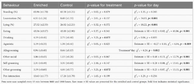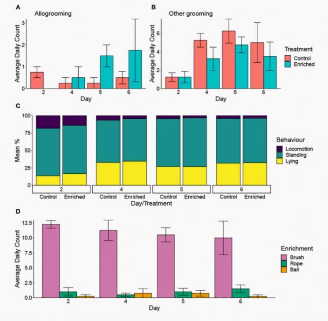 治療方式和天數之間存在顯著的交互作用,觀察到經過豐容處理的牛犢隨著時間的推移表現出更多的相互梳理行為(表1;圖2A)。豐容傾向于增加飲水量和“其他”梳理行為(例如,在圍欄設施上進行梳理),這些行為也隨著時間的推移而增加(表1;圖2B)。