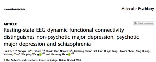 Chen H, Lei Y, Li R, et al. Resting-state EEG dynamic functional connectivity distinguishes non-psychotic major depression, psychotic major depression and schizophrenia[J]. Molecular Psychiatry, 2024, 29(4): 1088-1098.