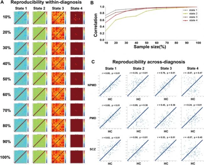研究結果顯示大腦狀態識別具有高度的可重復性,當使用樣本量達到70%時結果趨于穩定(圖2B);圖2C的相關性分析進一步證實了跨診斷組的泛化能力,健康對照組與各疾病組在多個狀態間呈現顯著空間相似性(如NPMD組在狀態1、2、3的r > 0.40, p < 0.01)。