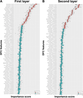 圖3表明動態功能連接特征在判別疾病中占據主導地位,Boruta算法篩選出的重要DFC特征數量(首層23個,二層26個)遠多于靜態功能連接特征(首層僅2個,二層僅6個)。