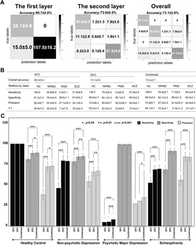 圖4A的混淆矩陣直觀顯示,基于動態功能連接(DFC)的分類器在四向診斷(HC、NPMD、PMD、SCZ)中實現了 73.1% 的整體準確率,其性能顯著優于靜態功能連接(SFC)僅 49.3% 的準確率。圖4C 的柱狀圖進一步表明,DFC方法在靈敏度、特異性和精確度等多個指標上均一致性地優于SFC方法。