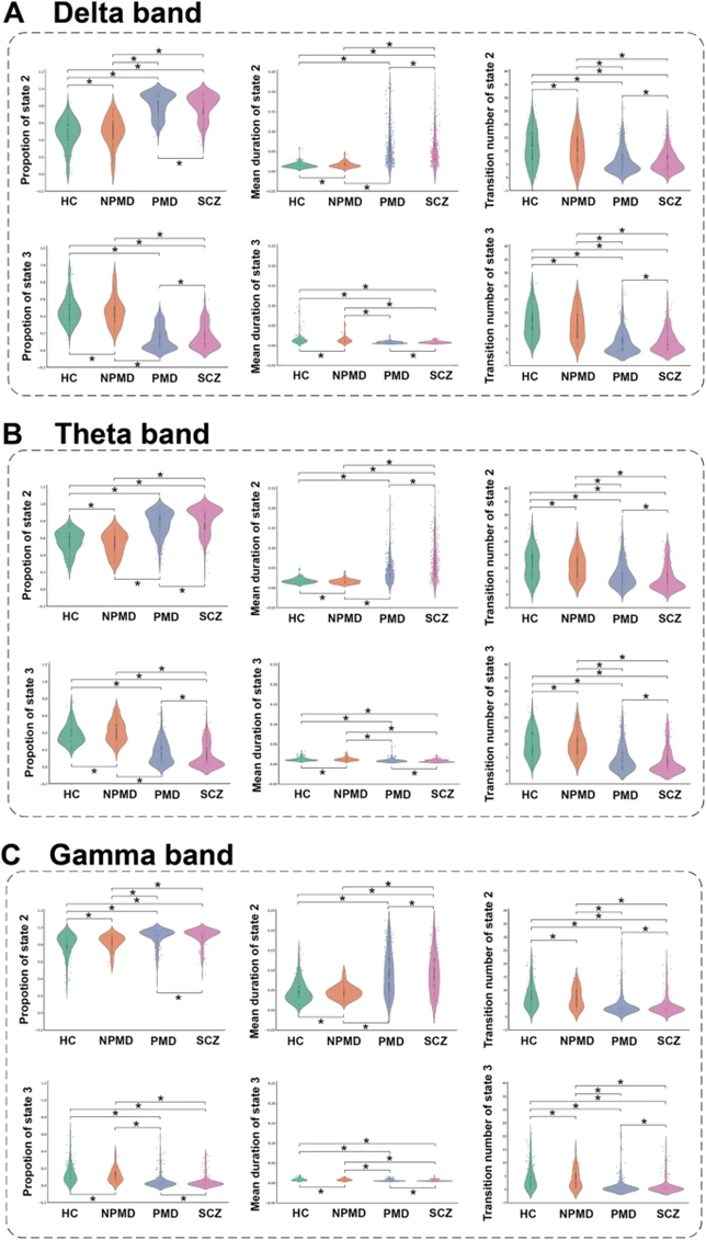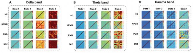 圖1. 大腦狀態結果圖。A各組的δ波段的特定大腦狀態;B各組的θ波段的特定大腦狀態;C各組γ波段的特定大腦狀態HC為健康對照組,NPMD非精神病性抑郁癥組,PMD精神病性重度抑郁癥組,SCZ精神分裂癥組