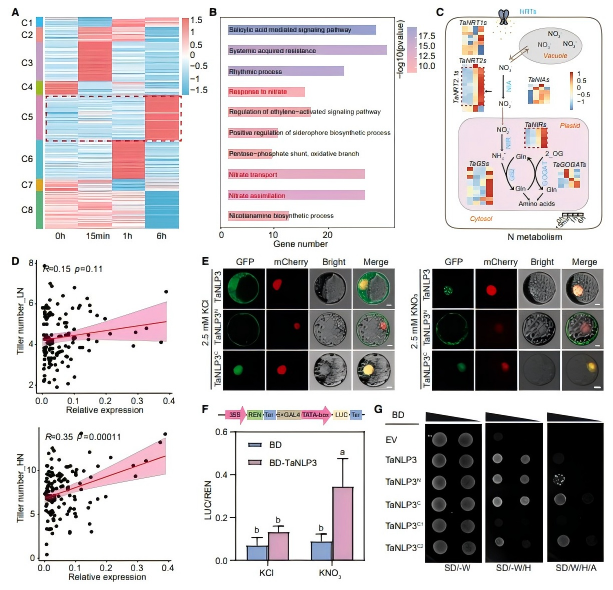 本研究通過對缺氮后復氮處理的小麥幼苗進行不同時間點(15min、1h、6h)RNA-seq分析,結合GO富集分析與候選基因關聯分析,鑒定到TaNRT2.1-6B4為小麥硝酸鹽響應關鍵標記基因,其表達量與分蘗數呈顯著正相關,且受硝酸鹽強烈誘導(轉錄水平提升5-180倍),成為連接氮吸收與分蘗發育的關鍵“信號樞紐”。