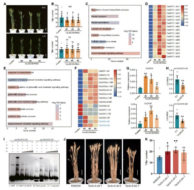 為解析TaNLP3在短期和長期硝酸鹽信號中功能背后的調控網絡,作者對TaNLP3敲除株系與Fielder對照在不同氮條件(NN、NS、NI)下的根系和地上部分進行轉錄組測序(RNA-seq),鑒定到調控小麥分蘗過程中的關鍵下游候選基因TaLBD38,原位雜交結果顯示,TaLBD38與TaNLP3均在小麥分蘗芽中表達,隨后通過對正常氮條件下生長的Fielder 和Tanlp3-4的分蘗芽進行了轉錄組測序驗證了TaNLP3–TaLBD38調控級聯在分蘗發育中的作用。