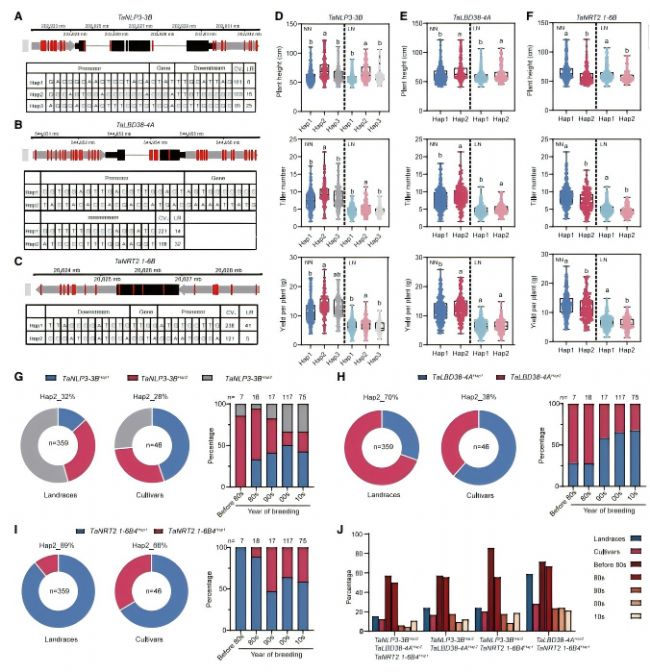 為評估TaNLP3-TaLBD38-TaNRT2.1調控模塊的育種潛力,團隊對405份小麥種質資源(359個栽培種、46個地方品種)進行單倍型分析,鑒定出3個關鍵基因的優異單倍型:TaNLP3-3BHap2、TaLBD38-4AHap2 和 TaNRT2.1-6B4Hap1。這些優異單倍型在現代栽培種中的頻率呈下降趨勢(部分從70%降至30%),這為通過分子標記輔助育種、回補優異單倍型提供了重要靶點——將這些單倍型聚合到同一品種中,有望培育出“低氮高產、高氮高效”的小麥新品種。