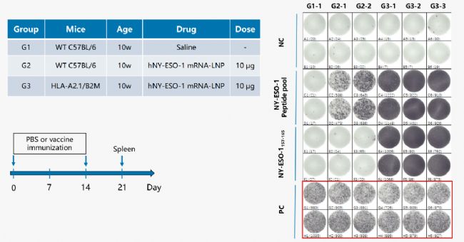 圖5 ELISpot檢測HLA-A2.1/B2M小鼠疫苗誘導的免疫反應。在肽庫刺激下,WT小鼠和HLA-A2.1/B2M小鼠均產生細胞免疫應答,且HLA-A2.1/B2M小鼠細胞應答更強;使用NY-ESO-1157-165刺激后,WT小鼠無應答,而hHLA-A2.1小鼠產生強烈細胞免疫反應,證實該小鼠能有效呈遞hHLA-A2.1限制性顯性表位NY-ESO-1157-165。